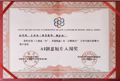 本次大赛由中国广播电视社会组织联合会、中国行业报协会与西安航空学院联合主办,以“用镜头描绘祖国低空经济发展的美好”为主题,设立纪录片、剧情片、AI及创意短片三大赛道。在全国300余件参赛作品中,我校学生作品脱颖而出,4组同学获大赛提名,4组同学获入围奖(其中纪录片赛道1组、AI赛道3组),入围作品未来将在百家主流媒体平台进行联播联展。指导老师魏金梅荣获“优秀指导教师”称号。