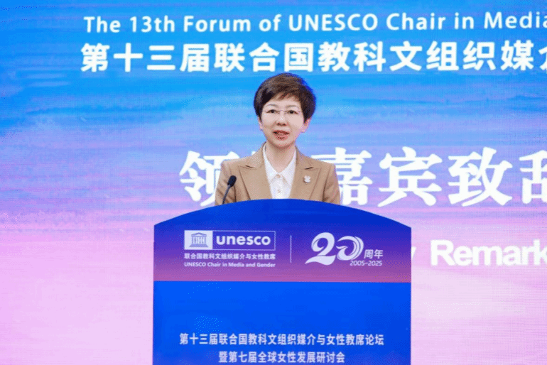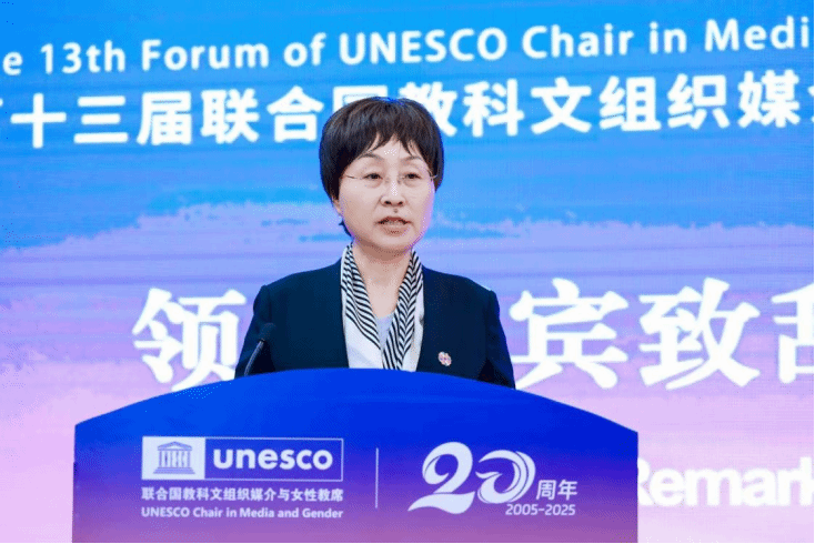 中国常驻联合国教科文组织代表团大使衔代表杨新育在致辞中向教席成立二十周年表示祝贺。她指出,教席成立以来,在推动性别平等和妇女赋能方面取得了卓越成就。此次论坛以“推动女性在AI时代的全面发展”为主题,顺应数字技术浪潮,为女性赋能,促进科技创新和社会治理中女性的广泛参与。她希望,联合国教科文组织媒介与女性教席不负使命,继续以知识启迪智慧,以教育赋能未来,努力推动性别平等与人类文明进步的征程。